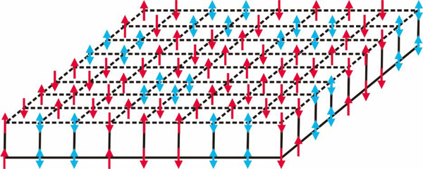 图1.自旋玻璃三维伊辛模型最小核模型示意图,其中红色自旋指向随机分布,并且蓝色自旋存在阻错。
