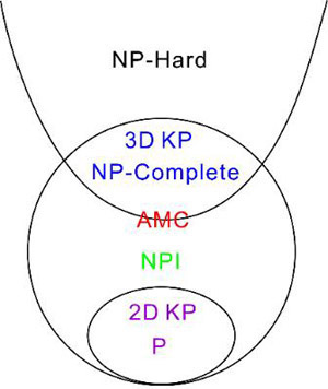 图3. 背包问题计算度的相图。其中NP中间问题(NPI)在NP完全问题与P问题之间,绝对最小核(AMC)模型在NP完全问题与NP中间问题的边界上。