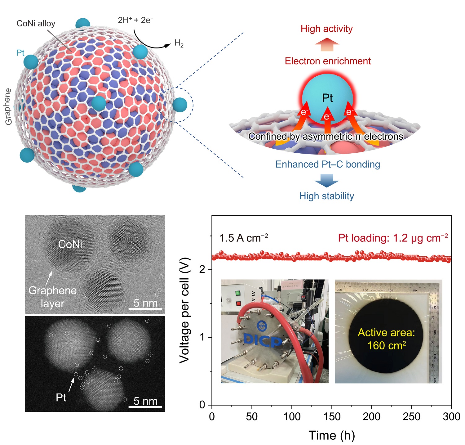 近日,大连化物所能源催化转化全国重点实验室能源与环境小分子催化研究中心(509组群)邓德会研究员和于良研究员团队与中国科学技术大学路军岭教授团队、大连化物所高效电解水制氢研究组(DNL0325组)俞红梅研究员团队合作,发现铠甲催化剂表面富集的不对称π电子具有独特的限域效应,可同时提升表面限域铂(Pt)原子的活性和稳定性?;诖?,合作团队设计合成了高活性、高稳定性的电解水制氢催化剂,并组装了千瓦级质子交换膜电解槽,实现了超低Pt载量、工业大电流密度下的高效酸性电解水制氢。