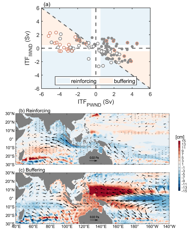 图2?印度洋对ITF驱动与缓冲效应的定义与机制。(a) 2014–2022年PWND与IWND试验中ITF异常(单位:Sv,1 Sv ≡ 10? m3 s?1),蓝红背景分别表示缓冲与驱动作用;(b-c)合成的缓冲与驱动作用中风应力与海平面异常空间分布