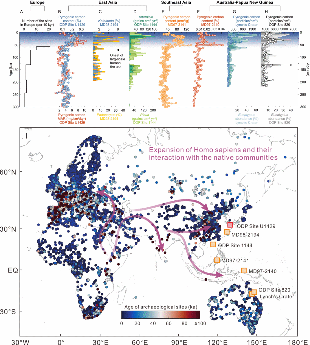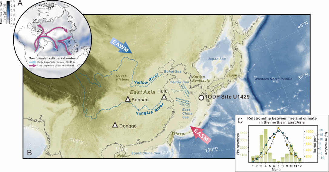 近日,中国科学院海洋研究所万世明团队在《美国国家科学院院刊》(PNAS,Proceedings of the National Academy of Sciences)发表了题为“Onset of extensive human fire use 50,000 y ago”的重要研究成果。该研究基于海洋沉积物中的黑碳记录重建了过去30万年以来东亚北部的古火演化历史,结合欧洲、东亚、东南亚及澳大利亚区域的记录以及考古遗址大数据,发现现代人类的大规模用火始于约5万年前。