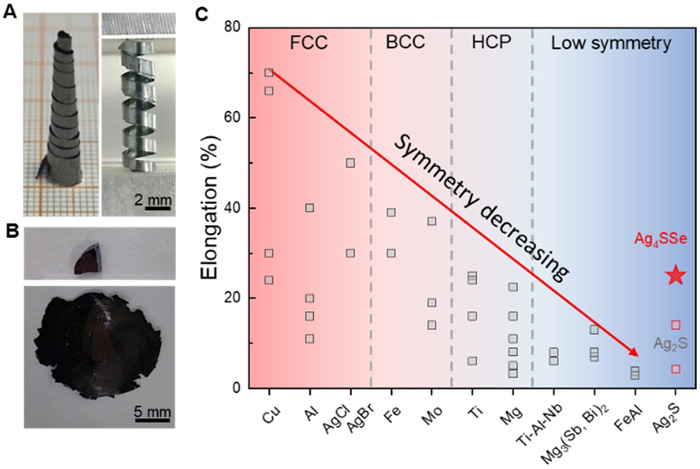 图1. Ag?SSe的良好室温塑性以及不同结构材料的室温延伸率
