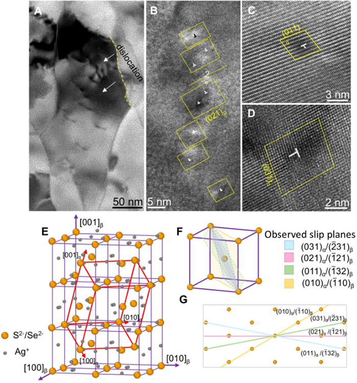 图2. Ag?SSe变形后位错的HRTEM图及其对应的准BCC结构阴离子亚晶格滑移面