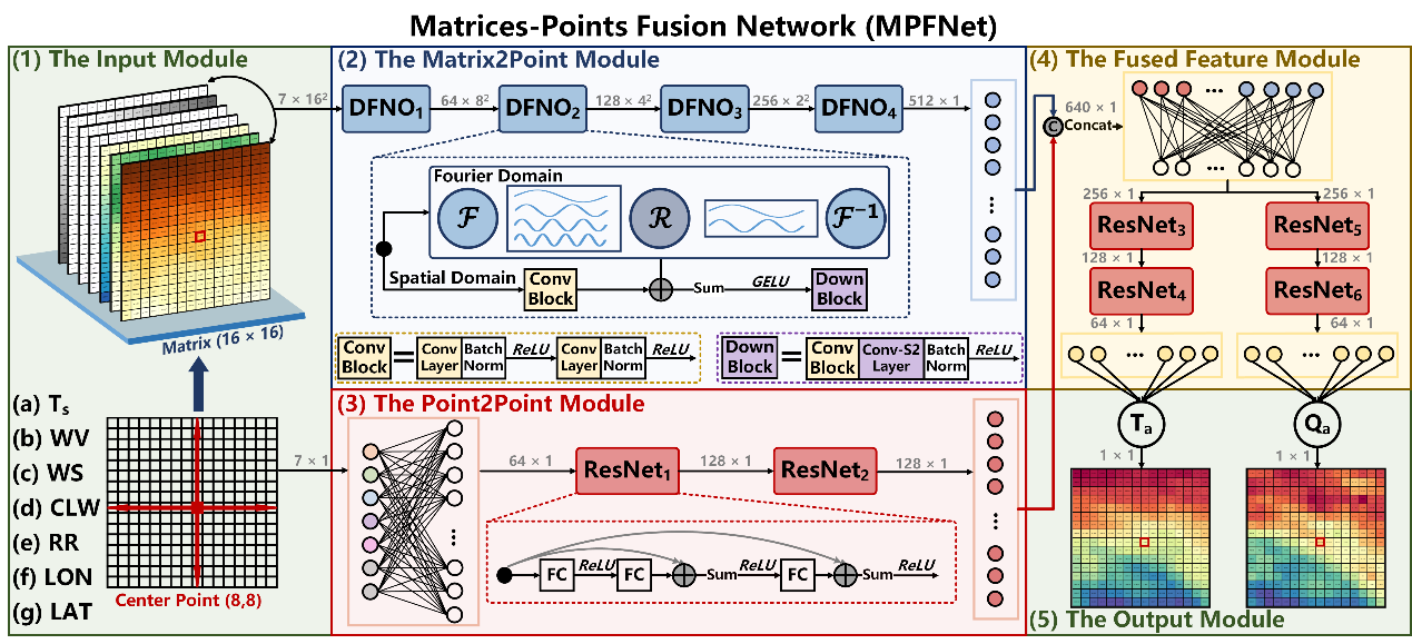 本研究聚焦于提升海表面2米气温(Ta)和比湿(Qa)的遥感反演精度,这两个变量是计算海气感热通量(SHF)和潜热通量(LHF)的关键输入,但传统方法往往面精度低、区域偏差大等问题。为此,研究团队创新性地提出了MPFNet(Matrices-Points Fusion Network),融合关键点特征和周围空间矩阵信息,结合Fourier神经算子与残差网络架构,实现了高精度的Ta与Qa反演。