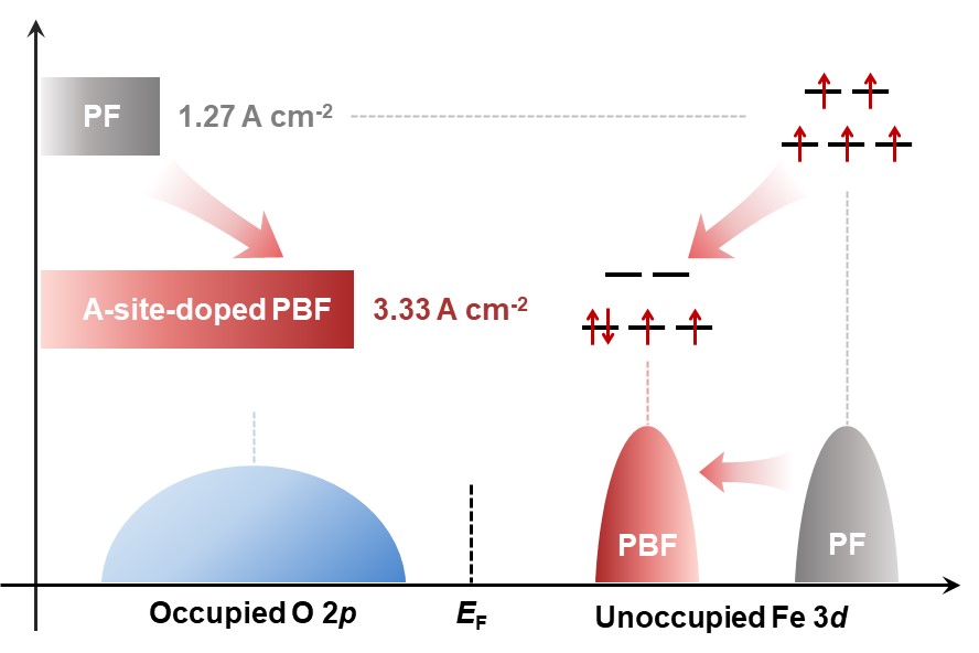 SOEC具有电流密度高、法拉第效率高、过电势低等优势,被认为是实现二氧化碳(CO2)减排和能源高效转换的关键技术之一,钙钛矿氧化物是常见的SOEC阳极材料。大量研究表明,在碱性电解水OER过程中,钙钛矿的电催化OER性能与eg轨道电子数呈火山型关系,在eg电子数接近1时活性最高。然而,目前对高温OER催化剂电子结构的精确调控机制尚不明确,尤其是eg电子占据数与高温OER活性的内在关联尚不清晰。