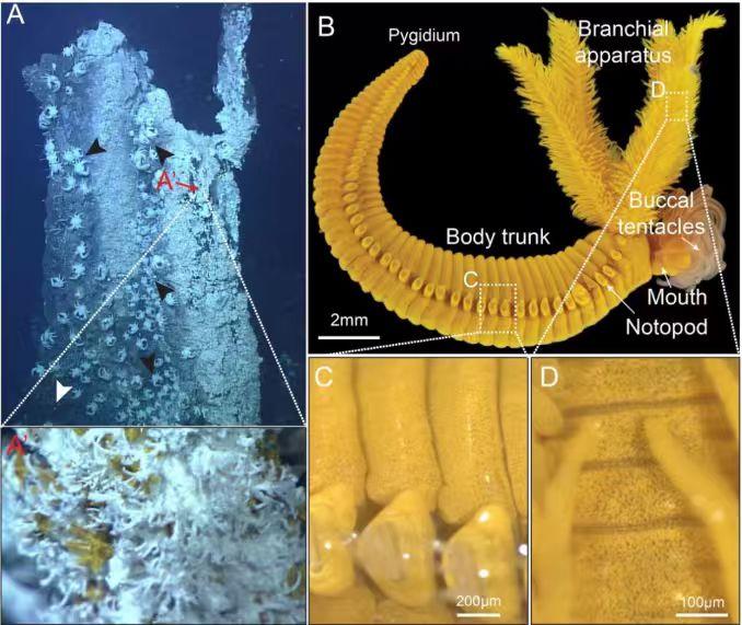图1?A:贺氏拟阿尔文虫生活的深海热液烟囱,其中A’显示热液喷口附近的贺氏拟阿尔文虫群落;B:贺氏拟阿尔文虫个体;C和D:贺氏拟阿尔文虫躯干及头冠皮下表的亮黄色颗粒。