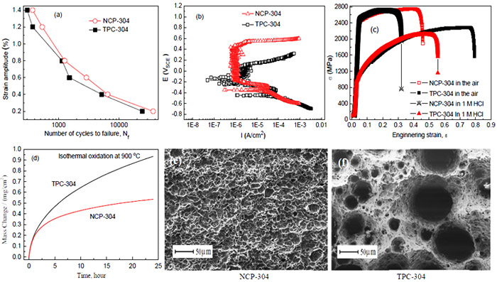 图1. 纳米晶和普通304不锈钢应变疲劳、电化学腐蚀、应力腐蚀和高温氧化性能