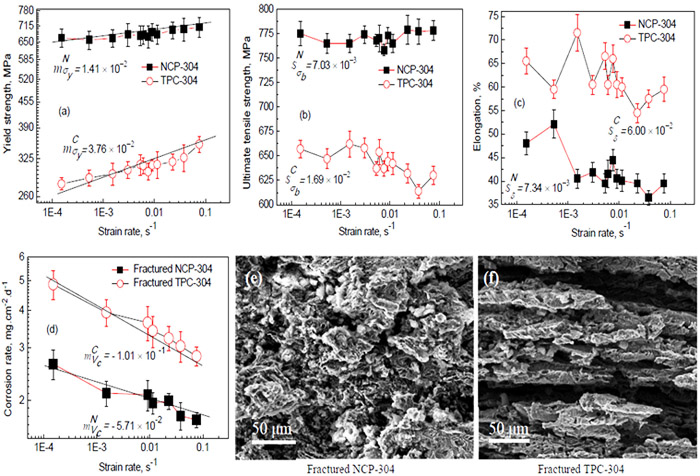 近期,研究人员发现,与TPC-304相比(应变速率1.52 × 10-4 s-1 - 7.60 × 10-2 s-1范围内),NCP-304屈服和抗拉强度分别提高303 MPa - 429 MPa和96 MPa - 166 MPa,延伸率为36.5% - 52.1%。NCP-304拉伸性能的应变速率敏感性低于TPC-304。在2 mol/L HCl溶液中室温浸泡25天,拉断后的NCP-304耐点腐蚀性能提高,腐蚀速率小于拉断后的TPC-304,腐蚀性能的应变速率敏感性低于拉断后的TPC-304。NCP-304 表面形变机理不变,TPC-304表面形变机理与应变速率有关。