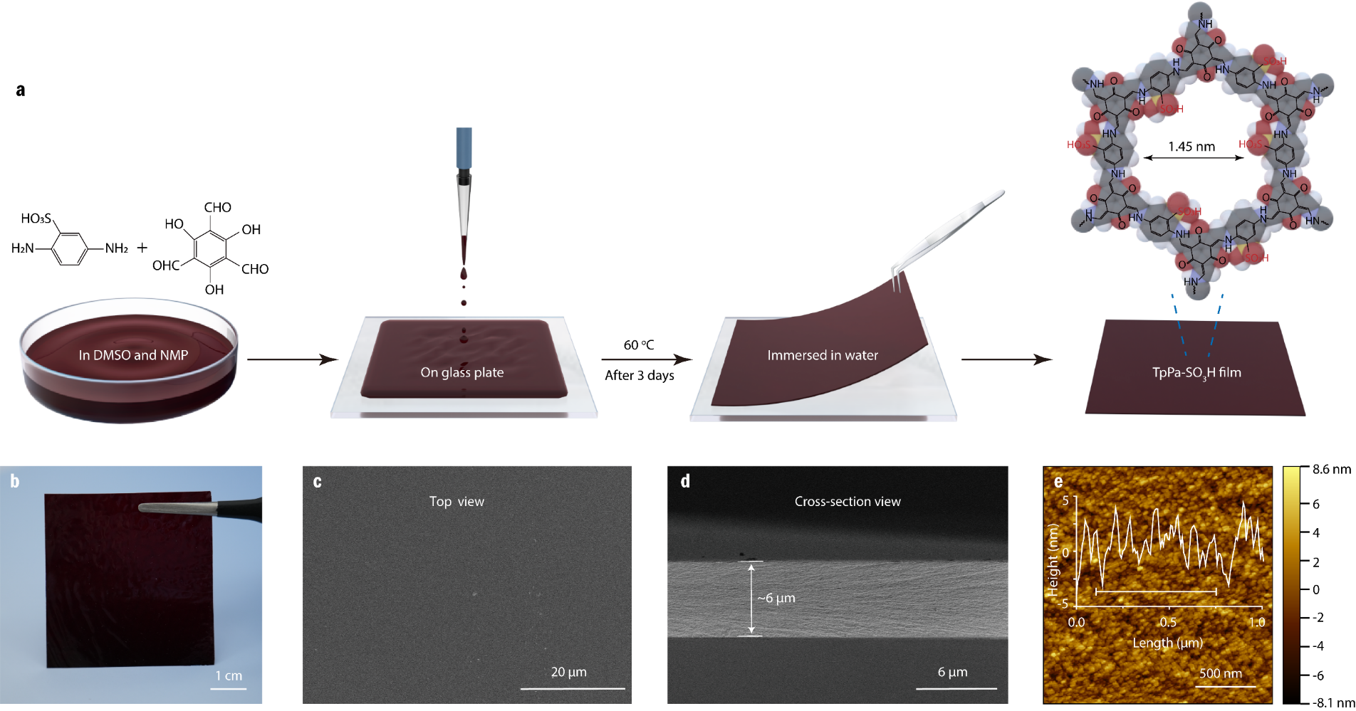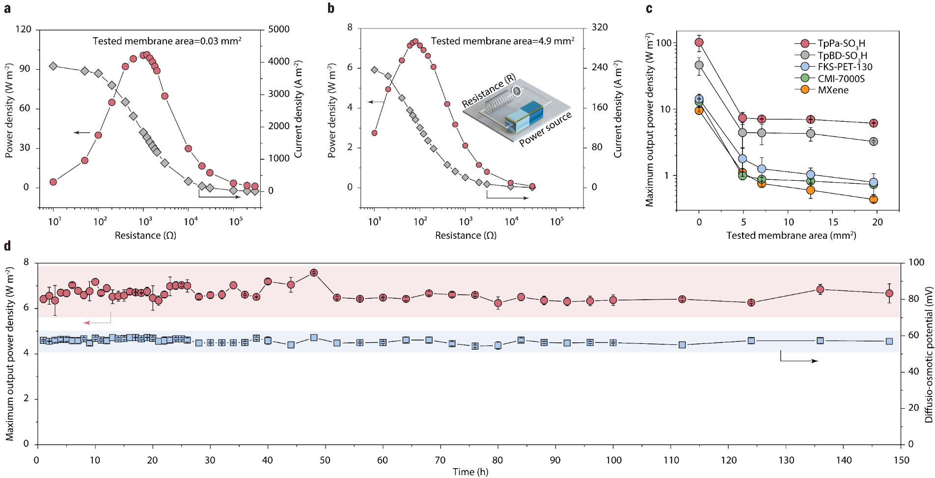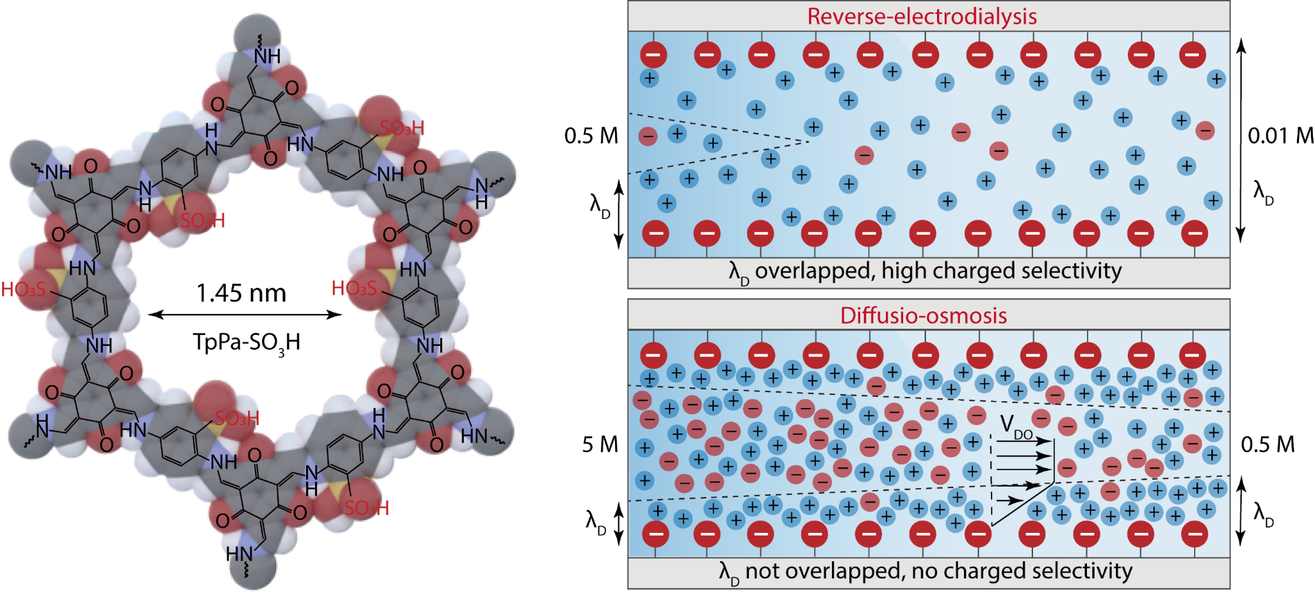 此前,利用单孔氮化硼纳米管、石墨纳米通道的研究已表明该机制有望实现超高功率密度的盐差能转换,但在膜尺度上仍缺乏相关研究。研究团队针对难以找到合适的膜材料匹配该机制开展研究,发现利用磺酸共价有机框架(COF)膜致密分布的磺酸基团、垂直排列的孔道结构,可以实现基于扩散-渗透机制的可规?;尾罘⒌纭?/span>