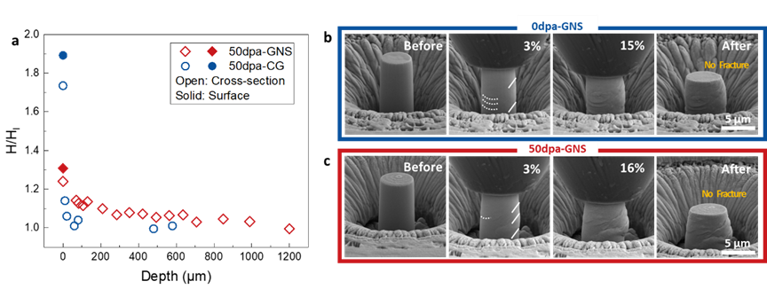 研究团队通过表面纳米化技术在广泛应用于核反应堆的304NG中制备了由高密度层错、低能界面和位错网络等结构特征组成的纳米结构,使得该材料具有优异的抗辐照能力。例如,在室温超高剂量(155 dpa)辐照后,GNS 304NG样品中的辐照缺陷密度和尺寸仅为粗晶样品中的3.8%和63%;在高温(450 °C)辐照时GNS 304NG样品也同样表现出比粗晶样品更为优异的抗辐照性能。结合微观结构表征和分子动力学模拟,研究团队发现,GNS 304NG优异的抗辐照性能与辐照诱发的自适应马氏体相变密切相关:辐照缺陷与材料中预制的层错相互作用而诱发马氏体相变,加速辐照缺陷的消失;此外,高密度层错还促使马氏体相向周围不断拓展,在加速消耗辐照缺陷的同时形成连续分布的马氏体相。进一步的微纳力学实验证实,GNS 304NG中大规模的自适应马氏体相变不会造成材料力学性能的恶化,将传统上辐照诱发马氏体相变造成材料脆化这一有害过程转变为一个有益的过程。由于自适应马氏体相变机制在从低剂量到极高剂量、从低温到高温的辐照下均保持有效,加之所采用的表面纳米化技术具有低成本和工业上易于实现的特点,本工作表明,将表面纳米化技术与自适应马氏体相变结合,可为现行及未来核设施提供一种大幅提升抗辐照能力的策略,应用于奥氏体不锈钢及钛合金等在辐照下可发生马氏体转变的金属材料中。
