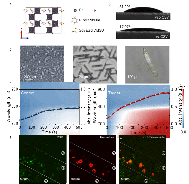近日,青岛能源所太阳能光电转化与利用全国重点实验室逄淑平研究员与香港科技大学周圆圆教授团队,提出一种创新的晶体-溶剂化物预晶种(CSV)诱导生长策略。该方法将低维卤化物晶体-溶剂化物(PDPbI4·DMSO)作为“晶种”,预沉积于SAM修饰基底上,从而实现对钙钛矿薄膜底部结晶过程、微观形貌及界面电子结构的全面调控。