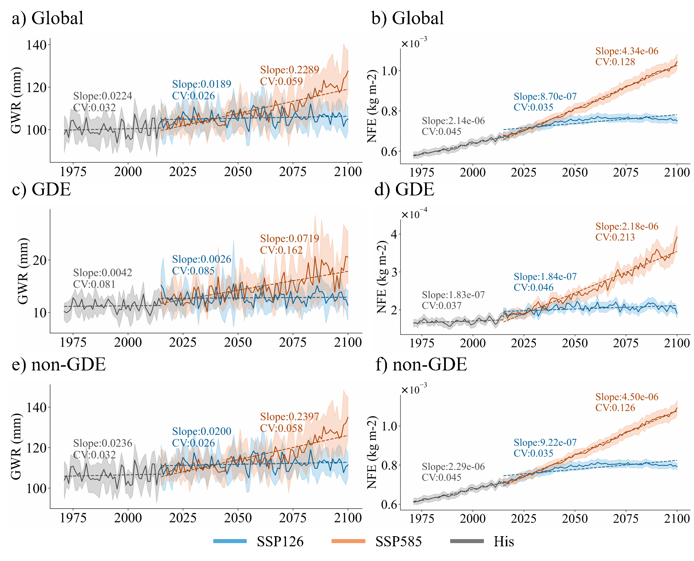研究结果表明:气候变化下,全球生态系统地下水补给与固氮效率呈协同增长趋势,且增幅与波动程度随排放情景的极端化提升;地下水补给是GDEs固氮效率提升最核心的贡献因子;气候变化驱动下,地下水补给对GDEs固氮效率的作用发生了从“限制效应”到“促进效应”的根本性转变,且驱动效应强度随排放情景呈现显著差异。