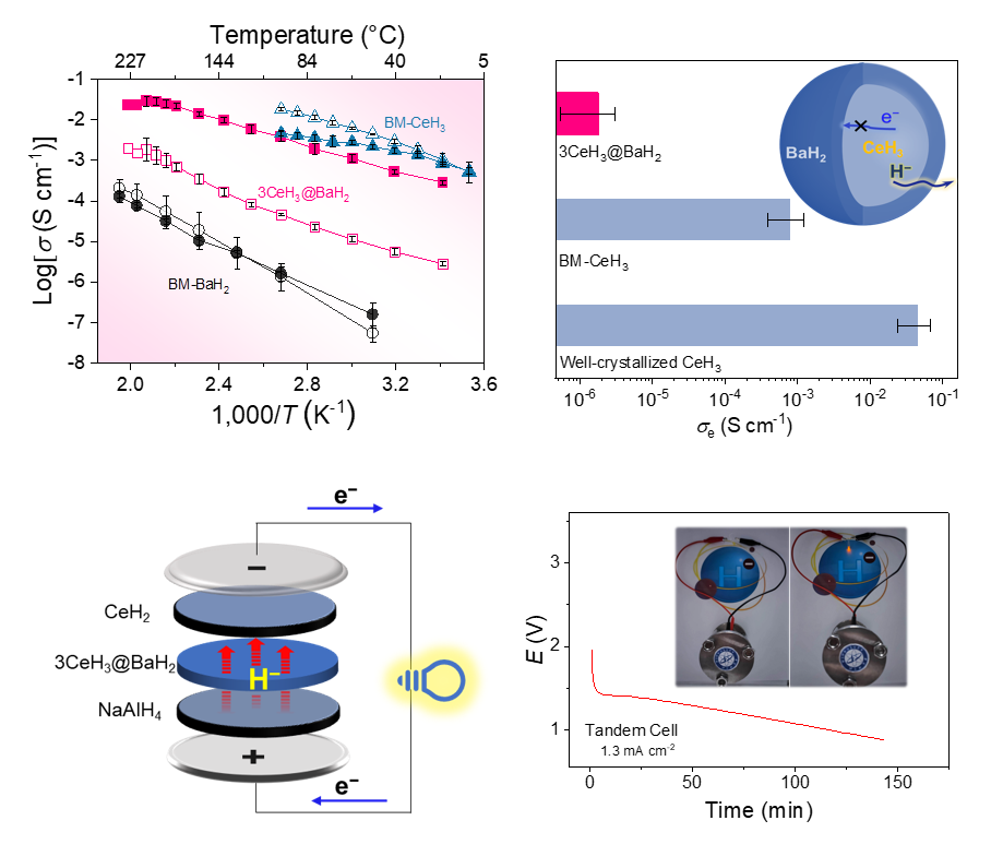 2018年,该团队启动氢负离子传导研究,并于2023年提出了“晶格畸变抑制电子电导”策略,研制出稀土氢化物基低温超快氢负离子导体(Nature,2023)。在本工作中,为克服上述材料热稳定性不足的问题,团队以大带宽高稳定性的BaH2薄层包覆稳定性较差的CeH3,形成了一种新型核壳结构复合氢化物3CeH3@BaH2,该材料在室温下即可展现快速的氢负离子传导特性,并具有优异的热稳定性和宽的电化学窗口,是一种理想的电解质材料,为全固态电池的研发奠定了基础。