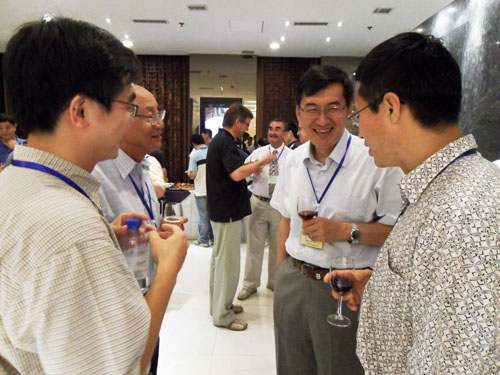 金属所所长卢柯院士出席会议欢迎酒会,向与会代表表示热烈欢迎。图为卢柯与麻省理工学院Sidney Yip教授、斯坦福大学蔡巍教授和俄亥俄州立大学王云志教授亲切交谈。