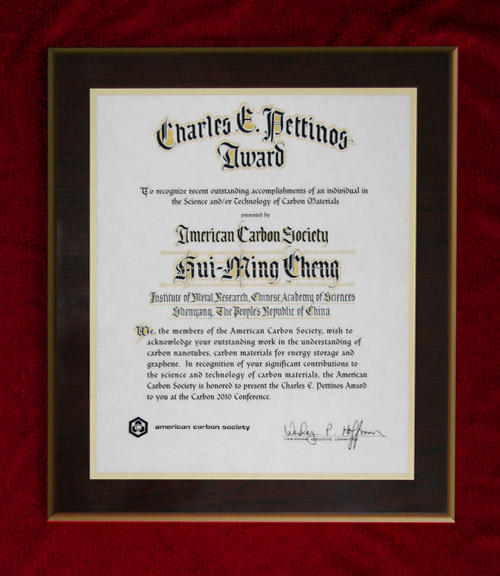 7月15日在美国Clemson大学召开的2010年度世界碳学术会议(Carbon 2010)上,金属所成会明研究员荣获2010年度Charles E. Pettinos Award。此奖项由美国碳素学会于1969年设立,评选并授予近期在碳科学与技术领域做出杰出成就的个人,2000年以前每两年、2000年以后每三年评选一次,每次仅选出一人。成会明研究员以其在理解碳纳米管、储能用炭材料及石墨烯方面的杰出研究工作而荣获此奖。此奖也是第一次授予中国科学家。在Carbon 2010学术会议上,成会明研究员还以“能量储存用碳基材料的研究进展”为题作了获奖纪念特邀报告,受到众多与会学者的好评。