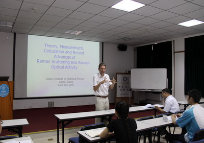《Journal of Raman Spectroscopy》杂志主编、美国雪城大学Laurence A. Nafie教授于6月-7月间应邀到中科院大连化学物理研究所访问,并为研究人员和青年学生进行了九场题为“Theory, Measurement, Calculation and Recent Advances of Raman Scattering and Raman Optical Activity”的拉曼光谱系列讲座。在为期一个月的讲座中,Nafie教授就拉曼光谱、手性拉曼光谱的基本原理、仪器布局、计算方法、研究进展及发展方向等进行了详细的阐述,与大连化物所师生进行了深入的学术交流,共同探讨手性光谱科学问题和未来发展趋势,并与该所就手性振动光谱研制和改造达成了进一步合作意向。