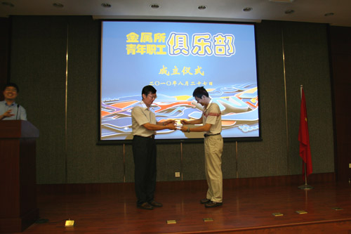 卢柯所长向金属所青年职工俱乐部首任秘书长张健研究员授牌,宣告俱乐部正式成立。