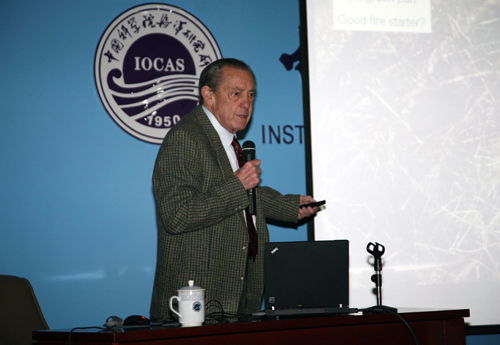 学术报告会上,孙松所长首先向Winslow Briggs教授颁发了“中国科学院爱因斯坦讲席教授”荣誉证书。Winslow Briggs教授作了题为“烟雾中新的植物生长调节因子”的学术报告,并与有科研人员围绕“植物蓝光受体”进行了探讨和交流。中科院实验海洋生物学重点实验室主任宋林生主持报告会。