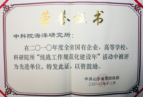 日前,山东省委统战部长会议在济南召开,山东省内各市委统战部长,各大企业高校、科研院所党委统战部长、省宗教局、省工商联有关负责人等180余人参加会议,会议对全省统战工作先进单位和先进个人进行了表彰。海洋所获“2010年度山东省国有企业、高等学校、科研院所统战工作规范化建设年活动先进单位”荣誉称号,全省获此项荣誉的单位共有 21个,海洋所是受表彰的两个科研院所之一。
