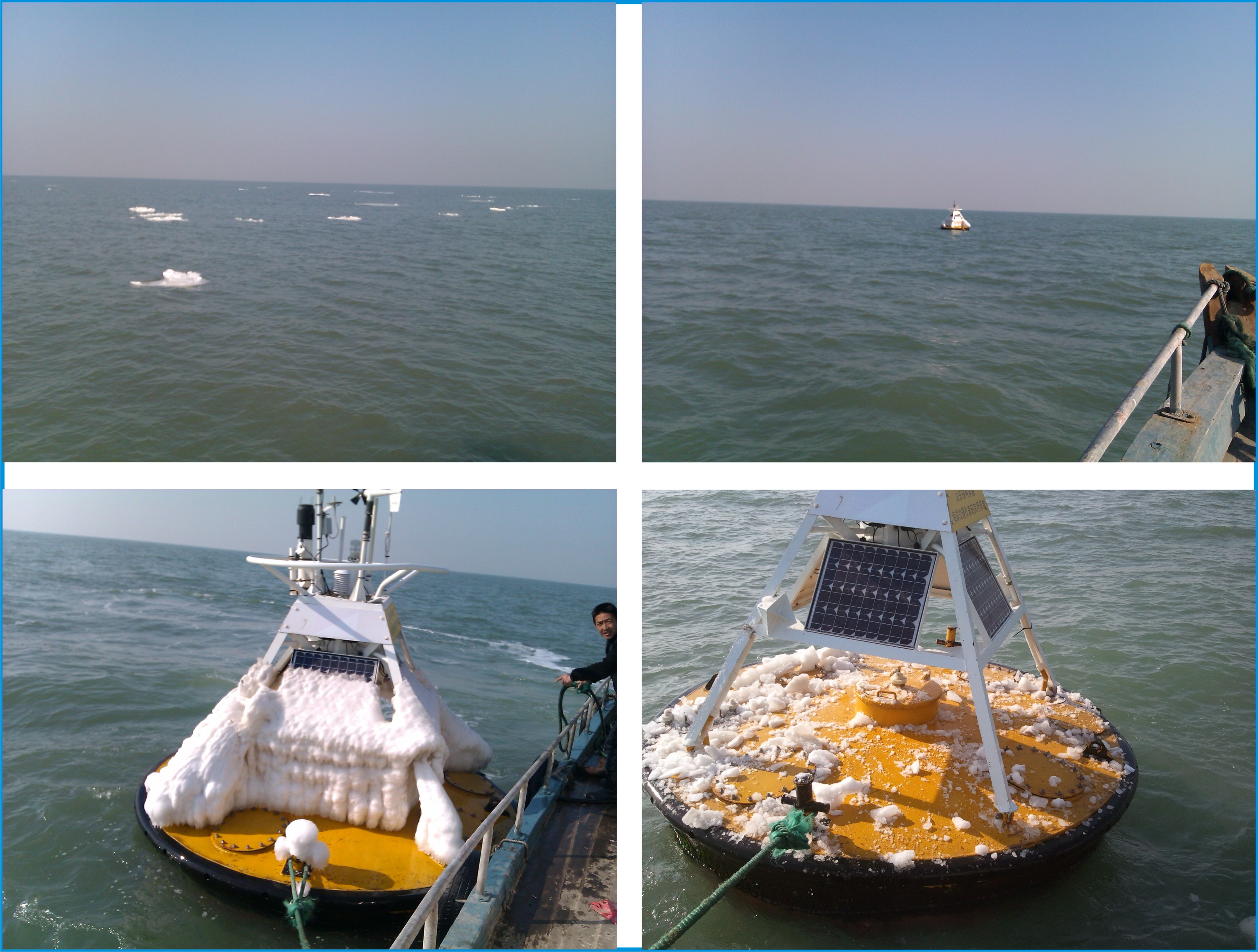 由于入冬以来,山东半岛尤其是威海、荣成一带多雪、天气极为寒冷,致使荣成楮岛近岸结了厚厚的冰,在距离海岸10公里的观测浮标系统布放海域都可看到浮冰。由于寒冷、多雪,使得观测浮标体和太阳能板上结满了厚厚的冰层,观测浮标系统水上部分几乎被厚厚的冰层覆盖,严重影响了观测浮标系统的正常运行。1月31日,项目组曾派人专程出海到现场进行观测浮标体和太阳能板除冰,但很快观测浮标体表面和太阳能板上又结满了厚厚的冰,降低了太阳能板向系统蓄电池组的充电效能,导致观测浮标系统因供电不足而停止运行。