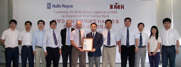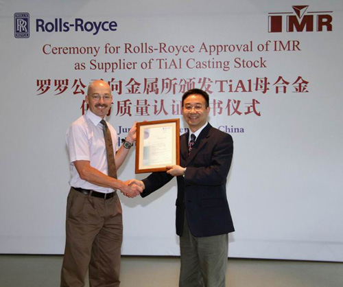 6月29日,英国罗罗(Rolls-Royce)航空发动机公司在沈阳举行隆重仪式,向中国科学院金属研究所颁发钛铝母合金供方质量认证证书,金属所从而成为全球首家通过罗罗公司该项认证的机构。