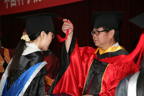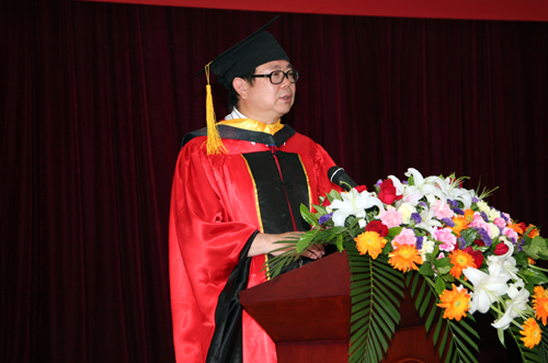 副校长侯一筠首先宣读了2011年度通过毕业答辩的学生名单,并向毕业生表示祝贺。校长孙松,副校长侯一筠、张国范、李铁刚为毕业生颁发学位证书、扶流苏。张国范副校长宣读了2011年“中科院优秀毕业生”、“山东省优秀毕业生”名单。