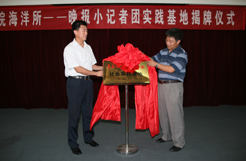 李铁刚副所长和李信阳处长共同为“青岛晚报小记者团社会实践基地”揭牌,兰君主编为海洋研究所“博士实践团”的4位同学颁发了“青岛晚报小记者团指导老师”的聘书。