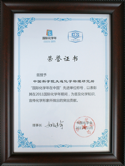 日前,中国化学会2011年工作会议在广东惠州大亚湾举行。会上,颁发了“国际化学年在中国”先进单位奖项,中科院大连化学物理研究所因在2011国际化学年期间普及化学知识、宣传化学形象做出的突出贡献而获此殊荣。