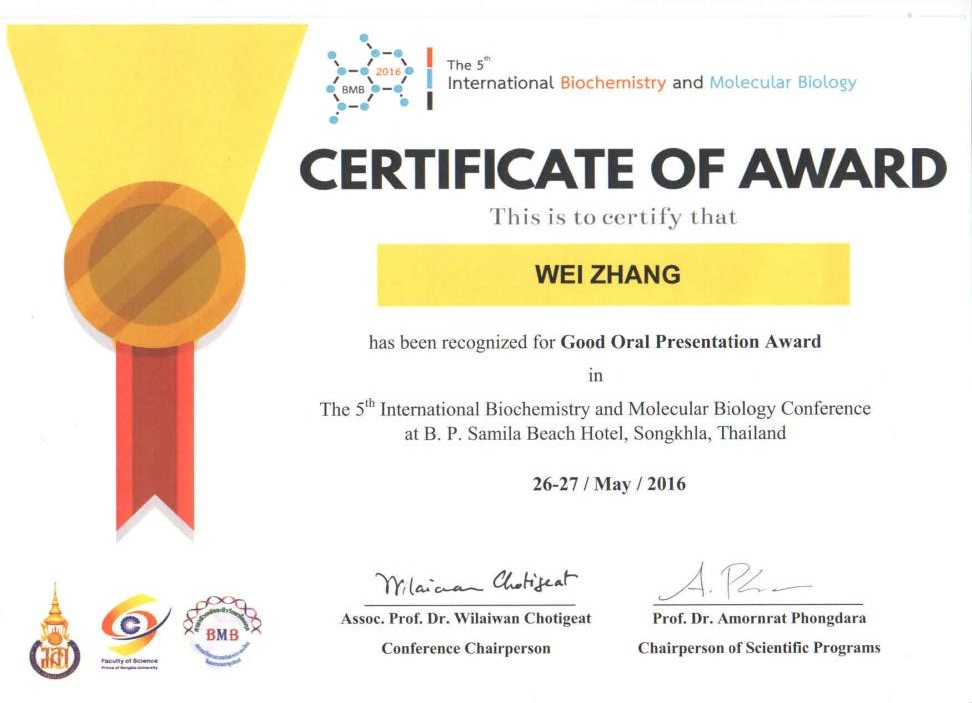 张伟的口头报告取得了较好的反响,并被评为该次大会的“优秀口头报告”。与会期间,张伟和参会代表在生物化学、分子生物学、酶工程等生物化学和技术领域进行了探讨交流,与泰国宋卡王子大学分子生物技术与生物信息学系教授Amornrat Phongdara、化学系教授Vatcharin Rukachaisirikul及泰国国家癌症中心的Danai Tiwawech教授达成了初步合作意向。通过本次会议,进一步增强和扩大了酶工程团队及研究所的国际影响力和知名度。