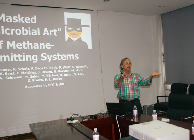 Drake教授在来访期间首先做了题为“Darwin’s Invertebrates: A Transient ‘Black Box’ Microbial Oasis”的学术报告,详细地介绍了他30年以来对生物与环境相互作用关系的理解,重点介绍了蚯蚓肠道如何作为暂时的微生物生存绿洲,对不同种类的微生物进行选择性的富集,从而改变土壤中微生物多样性和结构的过程,并对整个过程中的反硝化作用机理以及温室气体生成机理进行了详细的阐述。随后,作为AEM杂志主编,Drake教授又针对国内普遍存在的投稿接收率较低的现象,做了题为“Manuscripts: How To Avoid Headaches”的报告,耐心解答论文写作中应该注意的问题,详细指导如何将获得的实验数据和结果总结为精彩的论文发表。