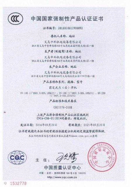义乌中科机电设备有限公司自2014年10月以来一直致力于研究点焊行业新技术和应用发展新方向,并开始开展3C认证工作。公司建立了专业的软硬件产品研发团队和运维团队,成立了3C认证的专业小组,针对焊接技术与应用的产品化进行创新性的设计、试验与推广。认证的顺利通过有力地印证了公司的关注新产品、自主创新研发理念。