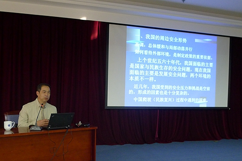 李福坤教授结合国内和国际形势,对我国的周边安全形势进行了全面介绍,强调海洋对我国发展的战略意义,并围绕南海局势、钓鱼岛问题的基本立场和应对策略进行了透彻解读。李教授还详细分析了中美、中日关系的现状和发展趋势,并就中国的军事力量与其他国家的军事力量进行了系统剖析。他指出,面对错综复杂的国际形势,关键要做好自己的事情,不断增强国家综合实力,妥善处理与周边国家的关系,构建海洋发展战略,加强国防建设,总体布局,主动作为,最终实现维护我国国防安全稳定目的,为建设社会主义现代化强国奠定基础。通过新鲜恰当的佐证事例、发人深思的时事观点、风趣幽默的授课方式,李教授赢得了参会人员的阵阵掌声。