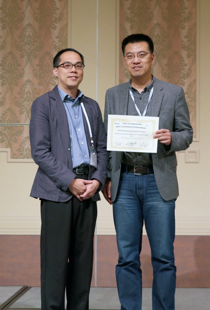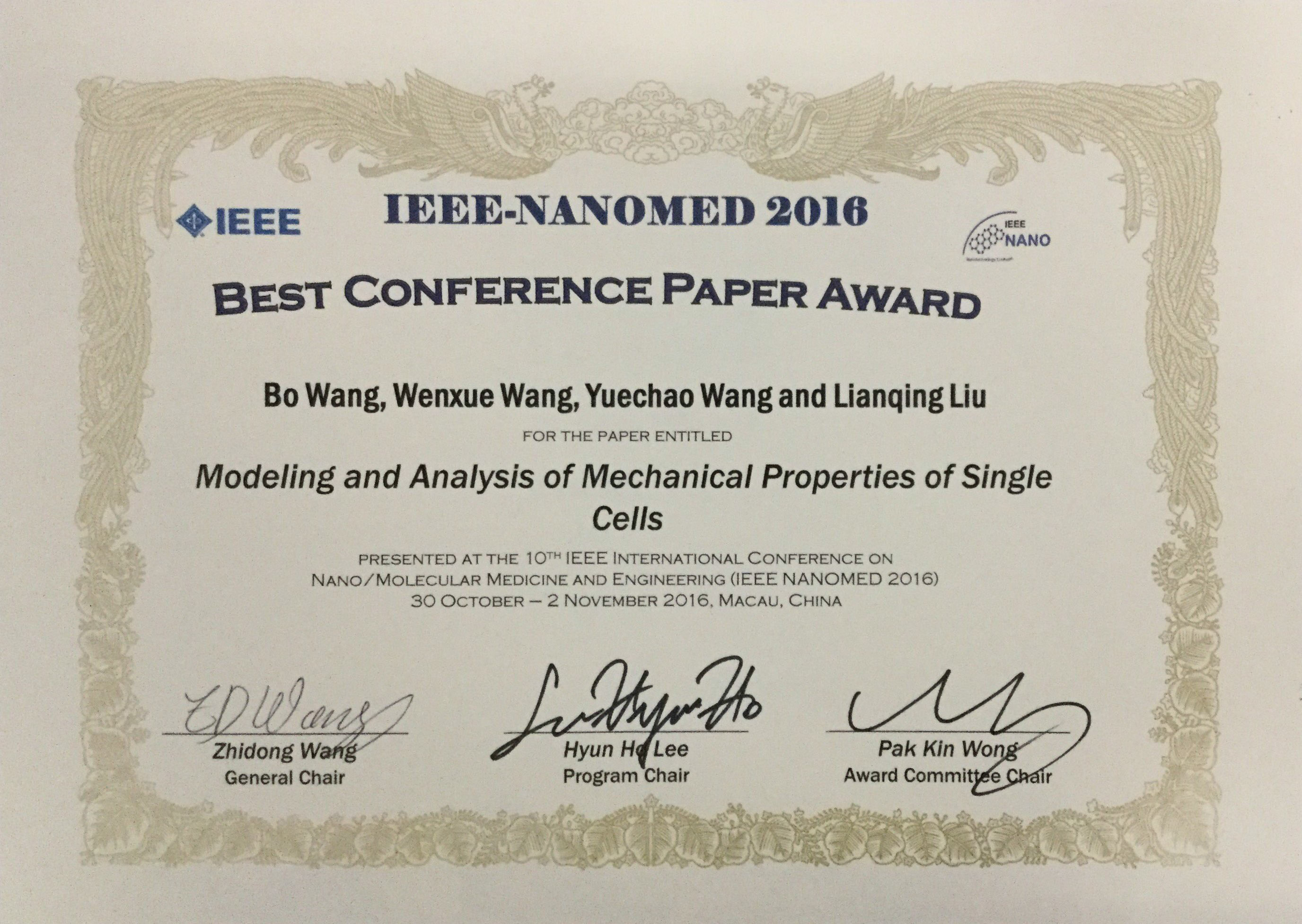 10月31日至11月2日,2016年度IEEE纳米/分子医学与工程国际会议(IEEE International Conference on Nano/Molecular Medicine and Engineering, NANOMED)在澳门举行, 来自世界各地微纳米操作、微纳生物检测以及微纳米生物医学等科学研究领域的科学家参会,展示了上述领域最为前沿的研究成果。中国科学院沈阳自动化研究所微纳米课题组博士生王博等合作完成的论文Modeling and Analysis of Mechanical Properties of Single Cells获得了本次会议的最佳会议论文奖。