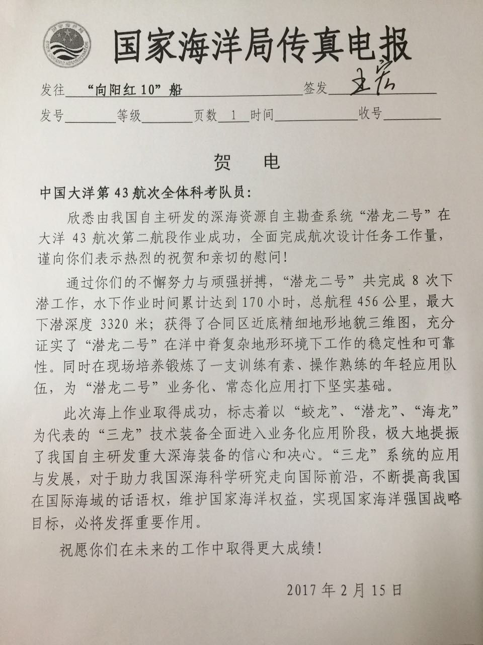 沈阳自动化所作为“潜龙二号”应用技术总体保障单位,精心组织,周密计划,人员分工明确,及时进行维护保养、水池测试,适时开展了应用培训。在东海完成了超短基线模式测试和布放回收演练。在全部工作准备就绪后,随“向阳红10”号科考船奔赴西南印度洋。通过大洋43航次成功作业,“潜龙二号”基本形成了洋中脊热液区作业规程,培养了一支训练有素、操作熟练的队伍。团队再次展现出了良好的精神面貌,同舟共济,不畏艰难,团结一心,顽强拼搏,圆满完成了本次任务。