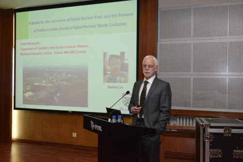 来访期间,David Shoesmith博士为金属所科研人员和研究生作了题目为“A MODEL FOR THE CORROSION OF SPENT NUCLEAR FUEL, AND THE RELEASE OF RADIONUCLIDES, INSIDE A FAILED WASTE CONTAINER”的李薰奖报告。报告前,张哲峰副所长代表金属所为David Shoesmith博士颁发了李薰讲座奖奖牌。颁奖仪式和报告由韩恩厚研究员主持。报告得到了金属所科研人员和研究生的热烈欢迎,听众纷纷踊跃提问,就感兴趣的问题与David Shoesmith博士进行讨论。来访期间,David Shoesmith博士与金属所科研人员和研究生进行了深入交流,并参观了沈阳材料科学国家(联合)实验室。