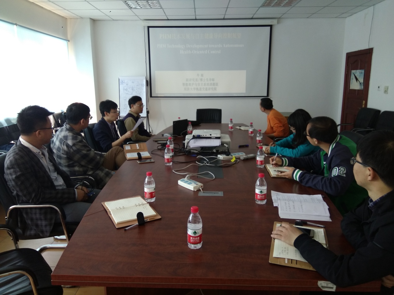 来访期间,牛刚作了题为《故障预测与健康管理(PHM)技术发展与自主健康导向控制展望》的学术报告。他介绍了装备健康管理技术的发展脉络、PHM技术体系、设计与开发流程和代表性案例。他以永磁同步列车牵引系统和电空混合制动系统为研究对象,介绍了基于PHM技术的自主健康导向控制发展方向。报告结束后,牛刚和与会人员就PHM在智能制造领域内的应用、设备预测性维护等问题进行了深入的交流。