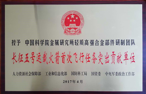 金属所轻质高强合金部件研制团队获“长征五号运载火箭首次飞行任务突出贡献单位”荣誉称号,为科学院唯一获此荣誉单位。参加长征五号运载火箭研制任务的轻质高强合金部件研制团队包括:杨锐、徐磊研究员的“Ti-5Al-2.5Sn ELI粉末冶金氢泵叶轮”项目组,陈荣石、韩恩厚研究员的“高强镁合金惯组支架”项目组,戎利建研究员、王本贤副研究员的“GH4169大口径薄壁管材、锻件”项目组。