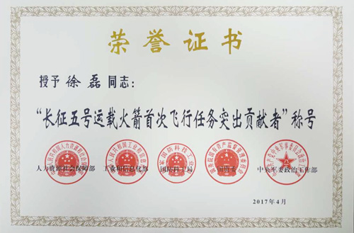 徐磊研究员获“长征五号运载火箭首次飞行任务突出贡献者”荣誉称号。