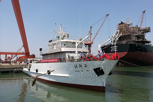 5月18日,中国科学院海洋研究所300吨级河口浅水型科学考察船“创新二”在山东蓬莱顺利下水。海洋所党委书记王辉、蓬莱市党组成员王成海、中柏京鲁船业有限公司董事长王轰等出席下水仪式。