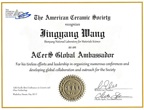 2017年5月21日至26日,第12届太平洋地区陶瓷与玻璃技术大会在美国夏威夷州科纳市举行,共有来自44个国家的1400多人参会。在此次会议中金属所王京阳研究员获得美国陶瓷学会授予的2017年度“ACerS Global Ambassador Award”。此奖项用于表彰在组织美国陶瓷学会相关国际会议和拓展该学会全球合作中持续做出贡献并处于领导地位的科学家,此次获奖人还包括美国陶瓷学会前任主席Mrityunjay Singh博士、美国陶瓷学会提名主席Tatsuki Ohji博士、美国陶瓷学会会刊主编William Fahrenholtz博士和日本产业技术综合研究所Manabu Fukushima博士。