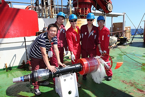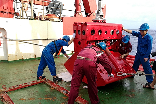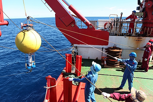 本次科学考察4月6日从青岛出发,历时65天,总航程11200海里?!拔魈窖笾心喜克遄酆系鞑楹酱巍崩?span>41天,完成大面综合调查站位67个,回收潜标2套,布放潜标5套,XCTD站位13个,布放Argo浮标7个,抛弃式湍流剖面仪(XMP)剖面观测3次,拍摄影像资料620G。项目负责人于非介绍,该航次观测海域水团包括南半球副热带次表层高盐水和中层低盐水、北半球副热带次表层高盐水和中层低盐水、赤道表层低盐水、副热带模态水等水团,观测断面PAC-ST-07纵跨西太平洋热带和副热带海域,35 N潜标正好布放在黑潮延伸体主轴区域,超过1年的温盐流连续观测数据将有助于研究其流速和主轴变化。