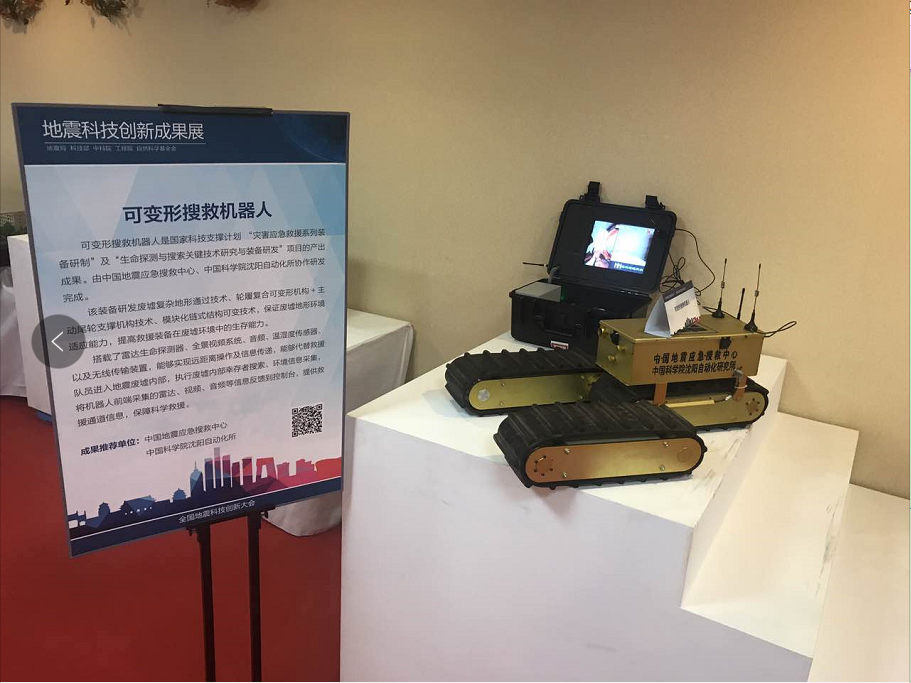 6月7日,2017年全国地震科技创新大会在北京隆重举行。大会由中国地震局会同科技部、中国科学院、中国工程院、国家自然科学基金会联合举办。中国科学院沈阳自动化研究所研制的可变形生命探测机器人作为全国地震科技创新成果震撼亮相。