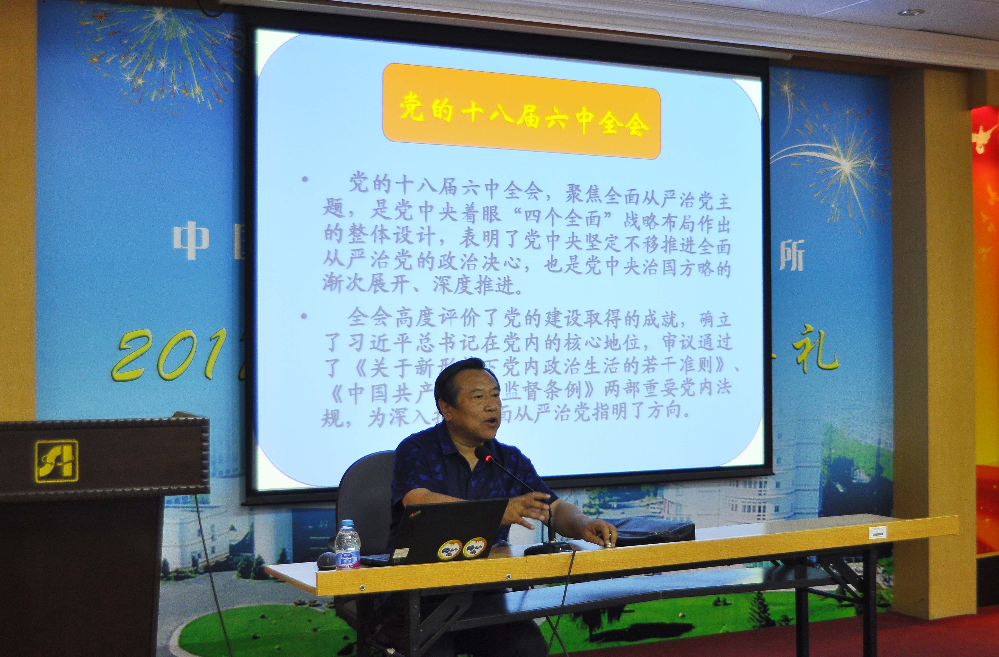 辽宁省委学校教授唐晓清以《学习十八届六中全会精神,推动全面从严治党向纵深发展》为题深入解读了十八届六中全会精神。他从聚焦从严治党讲起,分析了确立习近平总书记为全党核心的重要意义,论述了严肃政治生活、抓好党员干部工作、加强纪律建设、强化权力监督问责几方面内容。所党委要求全体党员同志进一步深入了解党的十八届六中全会精神,使之成为推进改革创新,践行“率先行动”的有力指导。(党办)