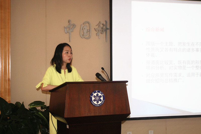 陈娜作了题为"On Science News Writing"的报告,以研究所科研进展英文宣传稿为例,详细介绍了英文宣传稿写作方式和要求,现场指导科研人员如何运用倒金字塔的写作技巧写出重点突出、简洁明了、吸引受众“眼球”的新闻稿。