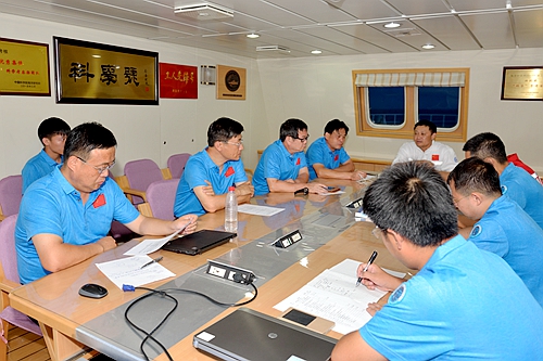 晚上7点,本航段首次工作协调会在四楼会议室召开?;嵋橛珊蕉渭际跏紫蒲Ъ摇⒅锌圃荷蜓糇远芯克彼だ钏堆芯吭敝鞒郑锌圃褐卮罂萍季滞踉匠殖ぃQ笞ㄏ钍紫蒲Ъ?、中科院海洋研究所孙松研究员,航次综合协调人、中科院海洋所船舶保障部李雷溪主任,调查队长王昊,船长刘合义,船载实验室主任孙宇峰及各设备主要负责人参加了会议。李硕研究员对本次科考任务进行了总体部署,与会人员讨论交流了具体作业情况,王越超局长、孙松研究员分别对确保船舶和人员作业安全、保障任务顺利完成进行了强调,提出了相关建议。