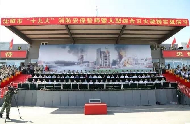 当日上午9点30分,沈阳市“十九大”消防安保誓师暨大型综合灭火救援实战演习在消防训练基地隆重举行。沈阳市政府各委办局,全省消防部队,各区、县(市)政府领导,市、区两级公安机关、警种支队领导和社会各界代表共1700多人参加了活动。835名消防官兵,158台各种消防车辆投入演习。