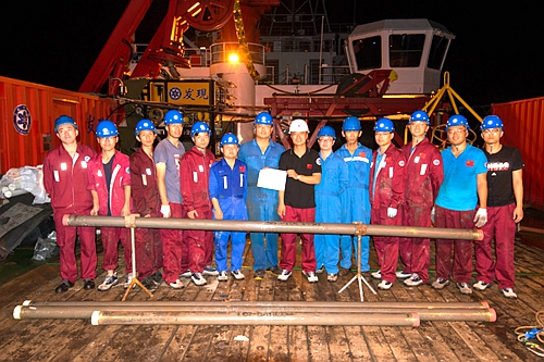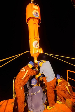 凌晨4点,“开拓3500”即将出水,所有在场队员心中既紧张又期待,尤其对本航次首席科学家、“开拓3500”设备研制负责人栾振东高级工程师来说更是如此。第一次下水共取样14.2m,而这一次会不会有新的突破呢?最终经过拆卸、取样、测量,第二次下水共取沉积物柱状样15.25m,比第一次下水取样长度提高1.05m,突破了该套设备设计取样最长长度!巧合的是12日当天正好是栾振东高级工程师的生日,而“开拓3500”取样长度实现新的突破也是给他的最好生日礼物。