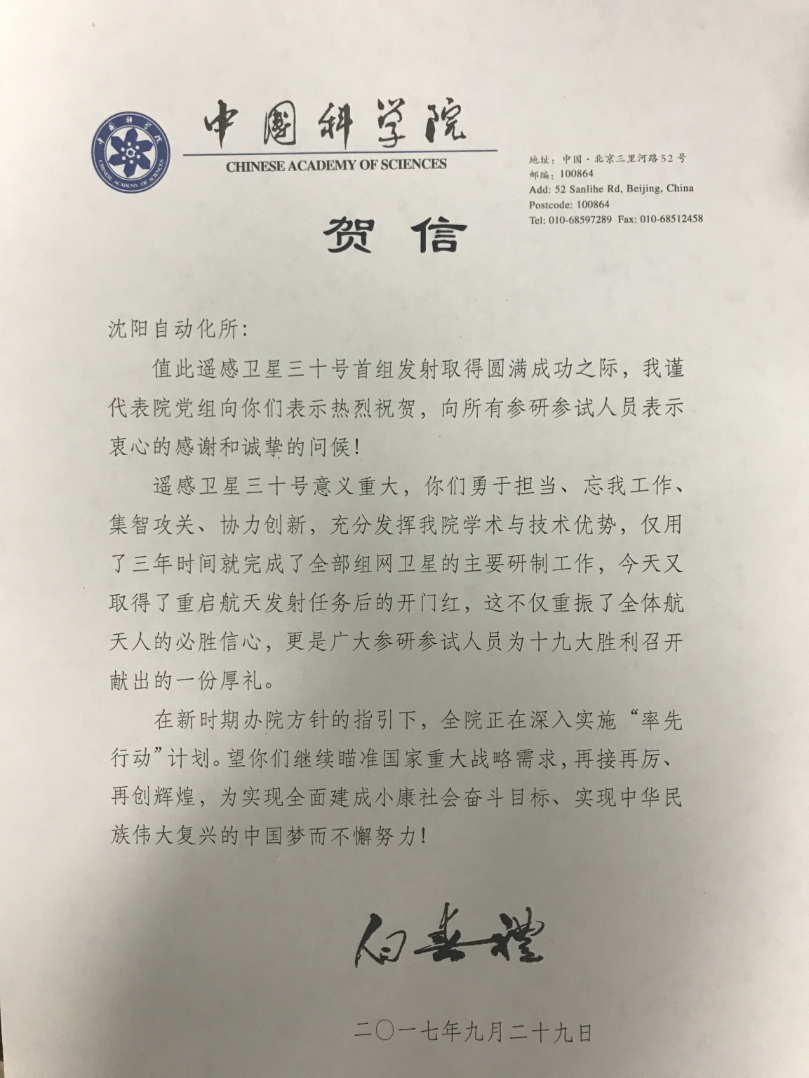 白春礼院长贺信