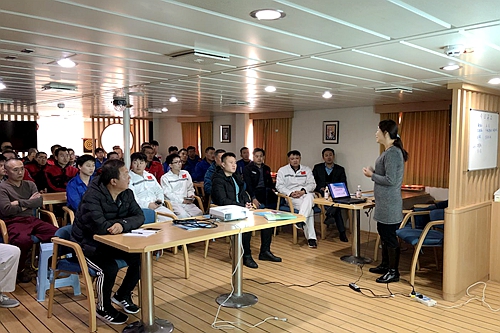 有过出??疾炀娜硕寄芴寤岬剑て谠逗蕉源瞎ぷ魅嗽钡?/font>心理状态会产生明显影响,使其处于亚健康状态。如何克服不良情绪的困扰,培养乐观、豁达开朗的心态,高质量地完成海上科考任务,显得尤为重要。青岛远洋船员职业学院副教授宫捷从实例和亲身体会娓娓道来,做了题为《船员心理压力与情绪管理》的心理健康讲座。宫捷副教授首先介绍了心理压力的概念及来源,并以自身多年的教育经验和亲身体验分析了船员的心理压力,进而疏导船员心理诉求,引导出海人员正确认识压力并提供积极的认知策略来应对压力,以达到减轻压力、做好情绪管理的目的。