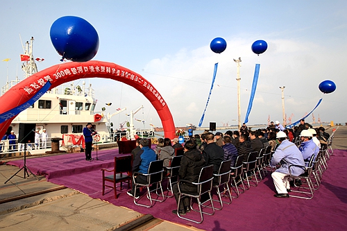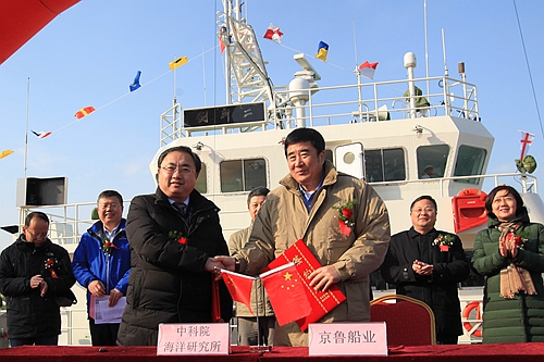 中科院条件保障与财务局高级工程师张红松、蓬莱中柏京鲁船业有限公司董事长王轰、中国科学院海洋研究所所长王凡分别致辞,中科院海洋所党委书记王辉主持仪式。